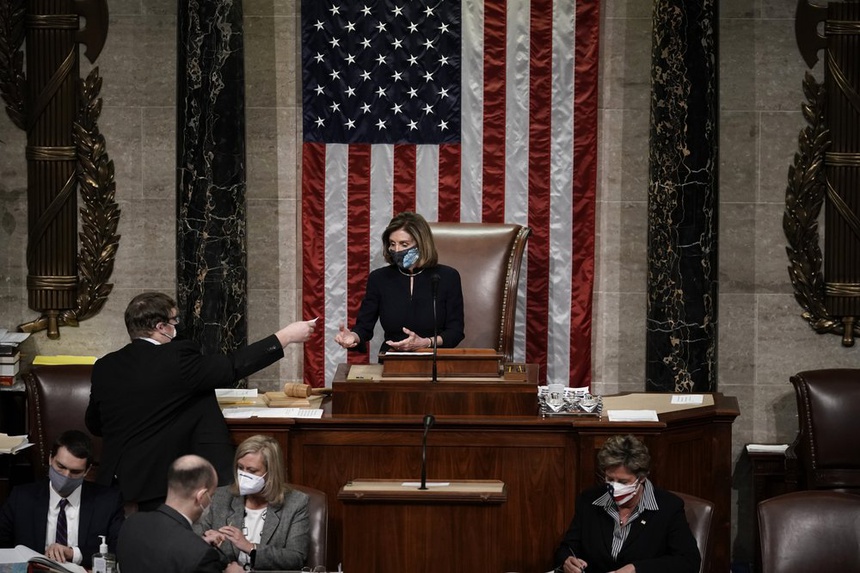 Chủ tịch Hạ viện Nancy Pelosi điều hành phiên bỏ phiếu luận tội Tổng thống Trump hôm 13/1. Ảnh: AP.