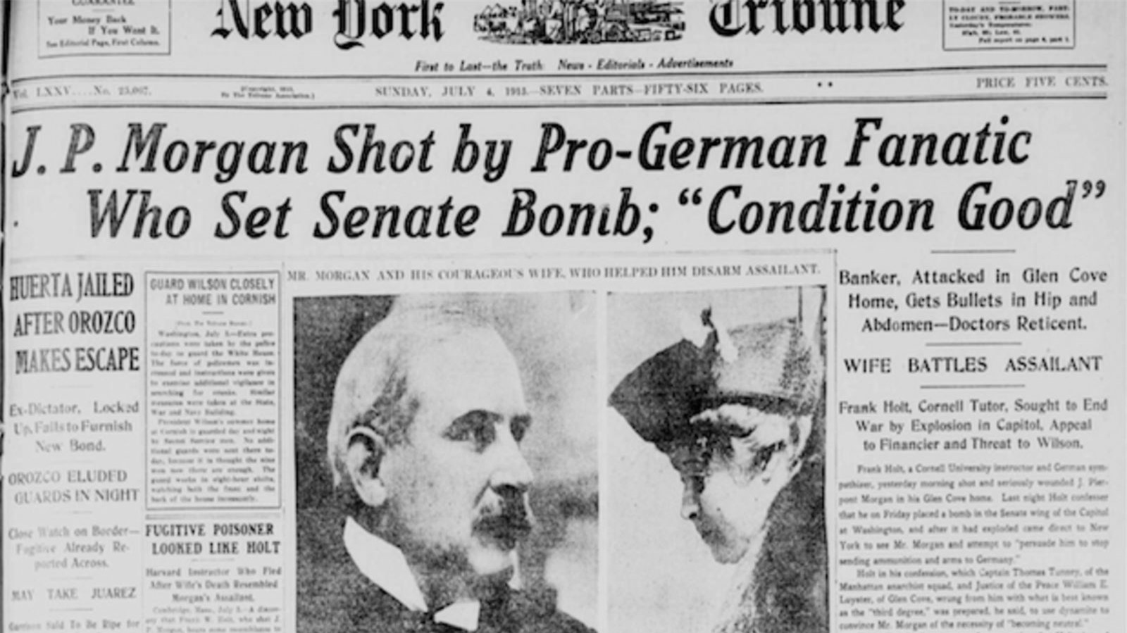 Tờ New York Tribune đăng tin J.P. Morgan bị bắn bởi chính thủ phạm đánh bom Thượng viện.