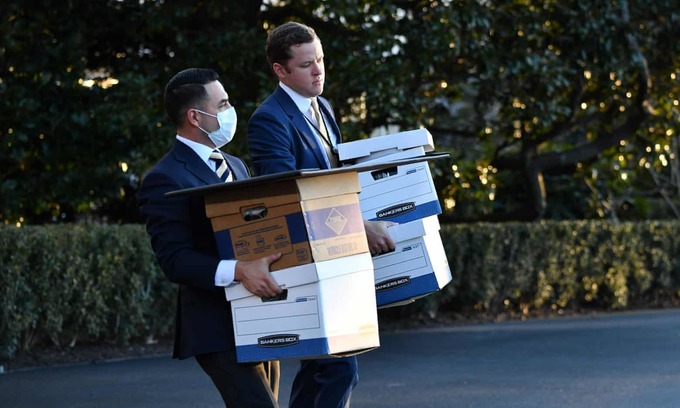Trực thăng Marine One đã hạ cánh trên bãi cỏ của Nhà Trắng để chờ đợi Tổng thống Donald Trump. Các phụ tá bê một số thùng ra.
