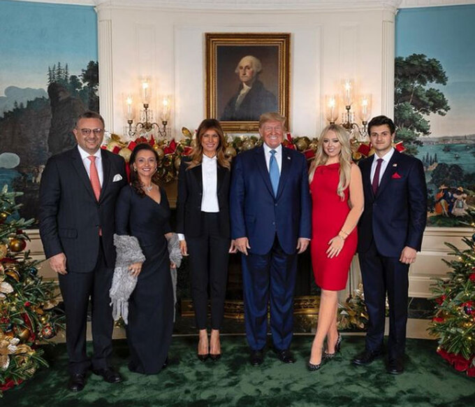 Michael (phải) cùng bố mẹ (trái) chụp ảnh với Tiffany (váy đỏ) và vợ chồng Trump tại Nhà Trắng vào Giáng sinh năm 2019. Ảnh: Instagram/Tiffany Trump.