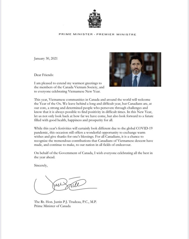 "Tôi vui mừng gửi tời chúc mừng nồng nhiệt nhất tới các thành viên của Hiệp hội Canada-Việt Nam và tới tất cả mọi người sắp đón mừng năm mới", Thủ tướng Canada Justin Trudeau mở đầu bức thư chúc Tết gửi cộng đồng người Việt ngày 30/1.