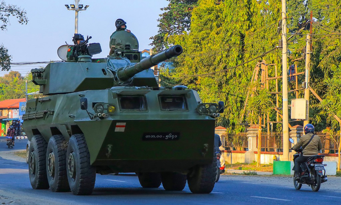 Thiết giáp PLT-02 của quân đội Myanmar đi tuần trên một con đường ở thành phố Myitkyina, bang Kachin, ngày 3/2. Ảnh: Reuters.
