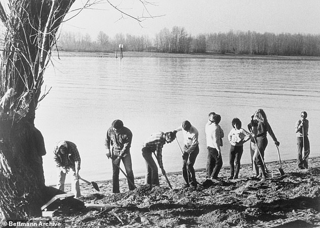 Năm 1980, 6.000 USD trong khoản tiền chuộc của D.B. Cooper được tìm thấy bên bờ sông Columbia, phía tây bắc Vancouver, Mỹ. Trong ảnh những nhân viên điều tra đang đào bới để tìm xem số tiền được phát hiện ở đâu. Ảnh: Bettmann Archive