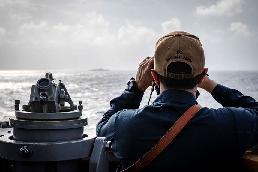 Thủy thủ tàu khu trục USS John S. McCain theo dõi một tàu gần quần đảo Hoàng Sa khi tuần tra tự do hàng hải vào ngày 5/2. Ảnh: Hải quân Mỹ.Tập trung vào Ấn Độ Dương - Thái Bình Dương