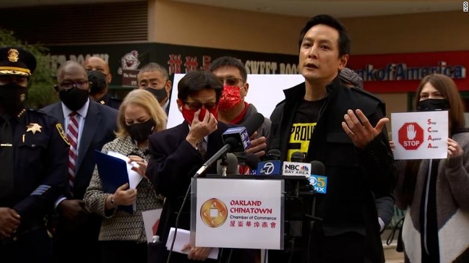 Diễn viên Daniel Wu trong cuộc họp báo ở khu Chinatown của Oakland hôm 8/2. Ảnh: KGO.