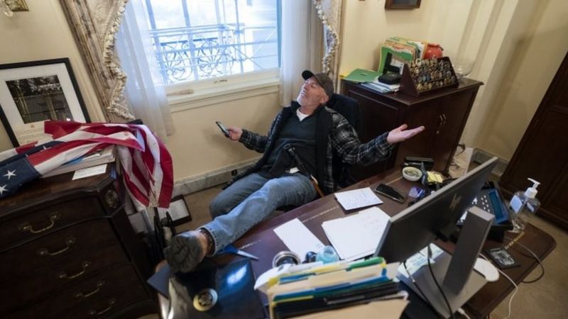 Trong một đoạn ghi hình khác, các nhân viên của bà Nancy Pelosi được nghe thấy phải thì thầm trong lúc ẩn náu khi những kẻ bạo loạn đột nhập văn phòng của bà và gọi lớn "Mụ đang ở đâu, Nancy" để tìm kiếm Chủ tịch Hạ viện.
