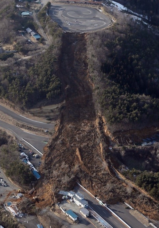 Ảnh chụp từ trên cao cho thấy một vụ lở đất gây ra do động đất tại Nihonmatsu, tỉnh Fukushima.