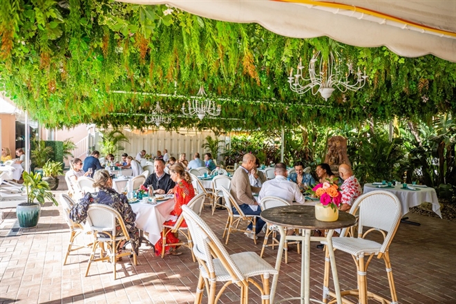 Café Boulud ở New York đóng cửa đến cuối năm 2021 nhưng tại cơ sở tại Palm Beach, thực khách thoải mái thư giãn trong sân rộng có cảnh quan tươi tốt.