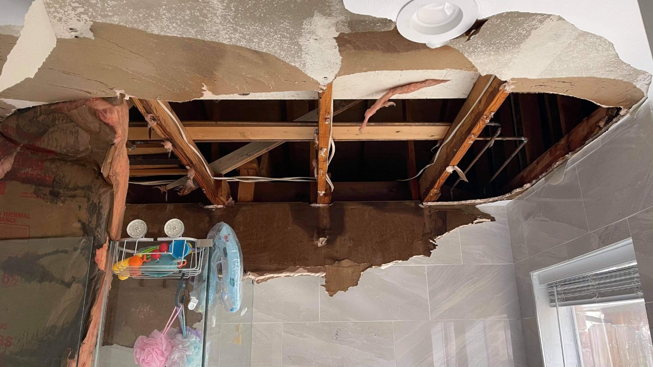 Không may mắn như Nam, một số người Việt chia sẻ trên các nhóm Facebook hình ảnh trần nhà bị hư hại do nước, chỉ còn trơ ra khung gỗ của trần nhà, và nhìn lên tận mái nhà.