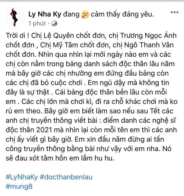 Lý Nhã Kỳ viết status hờn trách kèm hashtag "độc thân bền lâu", dân tình vừa thương vừa thả "haha"