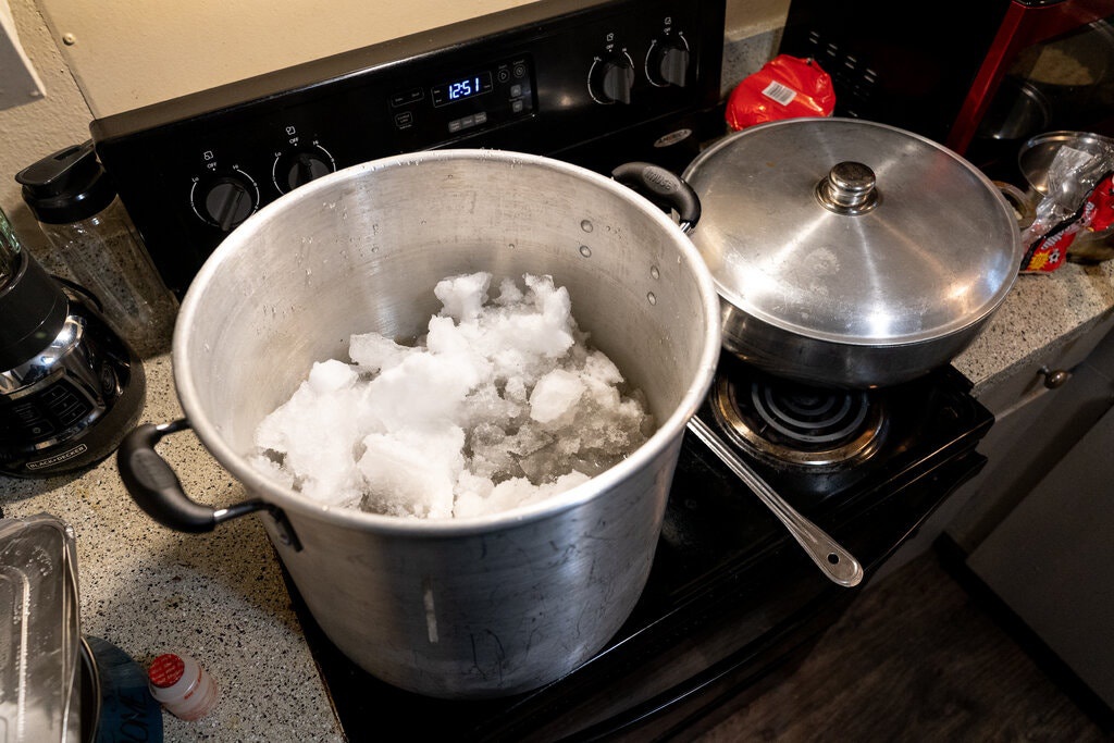 Một gia đình ở Austin đun tuyết để làm nước uống. Ảnh: NYT.