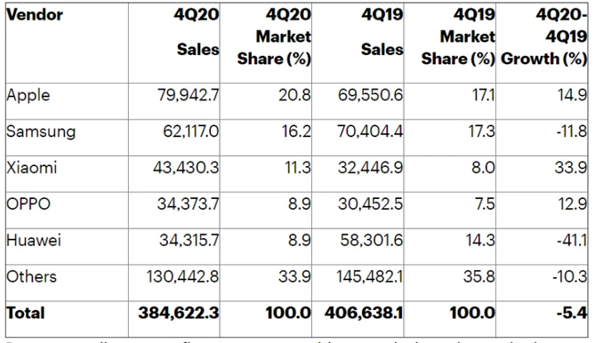 Bảng xếp hạng các hãng smartphone trong quý IV/2020.