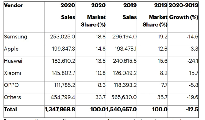 Thị trường điện thoại trong năm 2020 giảm khoảng 12,5% so với năm trước. Tổng số smartphone tiêu thụ là hơn 1,3 tỷ.