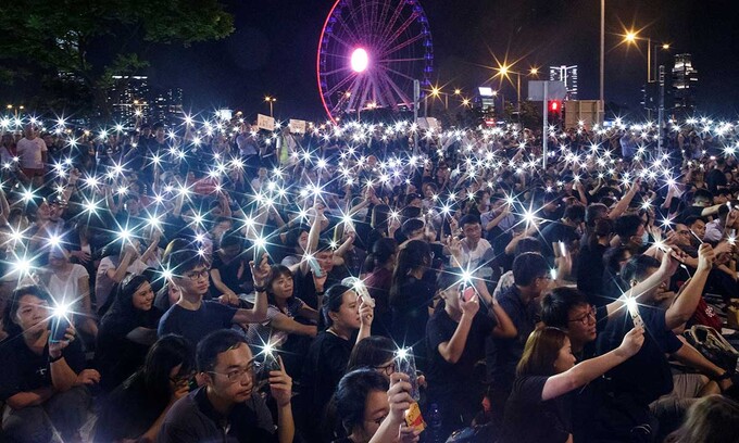 Người dân Hong Kong đồng loạt giơ đèn điện thoại trong cuộc biểu tình phản đối dự luật dẫn độ hồi tháng 6/2019. Ảnh: Reuters.
