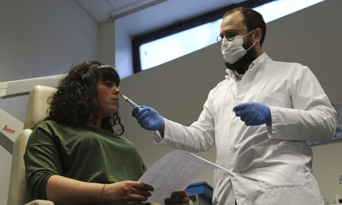 Bác sĩ Clair Vandersteen (phải) cho Gabriella Forgione ngửi ống chứa mùi hương tại Nice, Pháp ngày 8/2. Ảnh: AP.