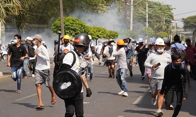 Người biểu tình ở Yangon tháo chạy sau khi bị cảnh sát bắn hơi cay và đạn cao su ngày 28/2. Ảnh: Nikkei.