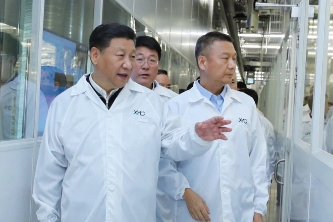 Chủ tịch Trung Quốc Tập Cận Bình thăm hãng chế tạo bán dẫn Xinxin ở thành phố Vũ Hán, tỉnh Hồ Bắc, tháng 4/2018. Ông Tập nói rằng tự cường về công nghệ có ý nghĩa trọng tâm đối với vị thế của Trung Quốc trên thế giới (Ảnh: Xinhua)