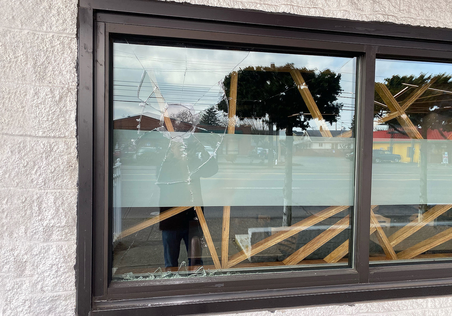 “Cửa kính hai lớp ở ngay trước mặt tiền tiệm, hướng của đường 82, may mắn là bị vỡ phần kính ngoài, không xuyên vào lớp kính thứ hai,” ông Thu Nguyễn, chủ nhân nhà hàng Utopia Restaurant & Lounge ở Portland, Oregon, nói việc nhà hàng bị ném đá. (Hình: Thu Nguyễn cung cấp)