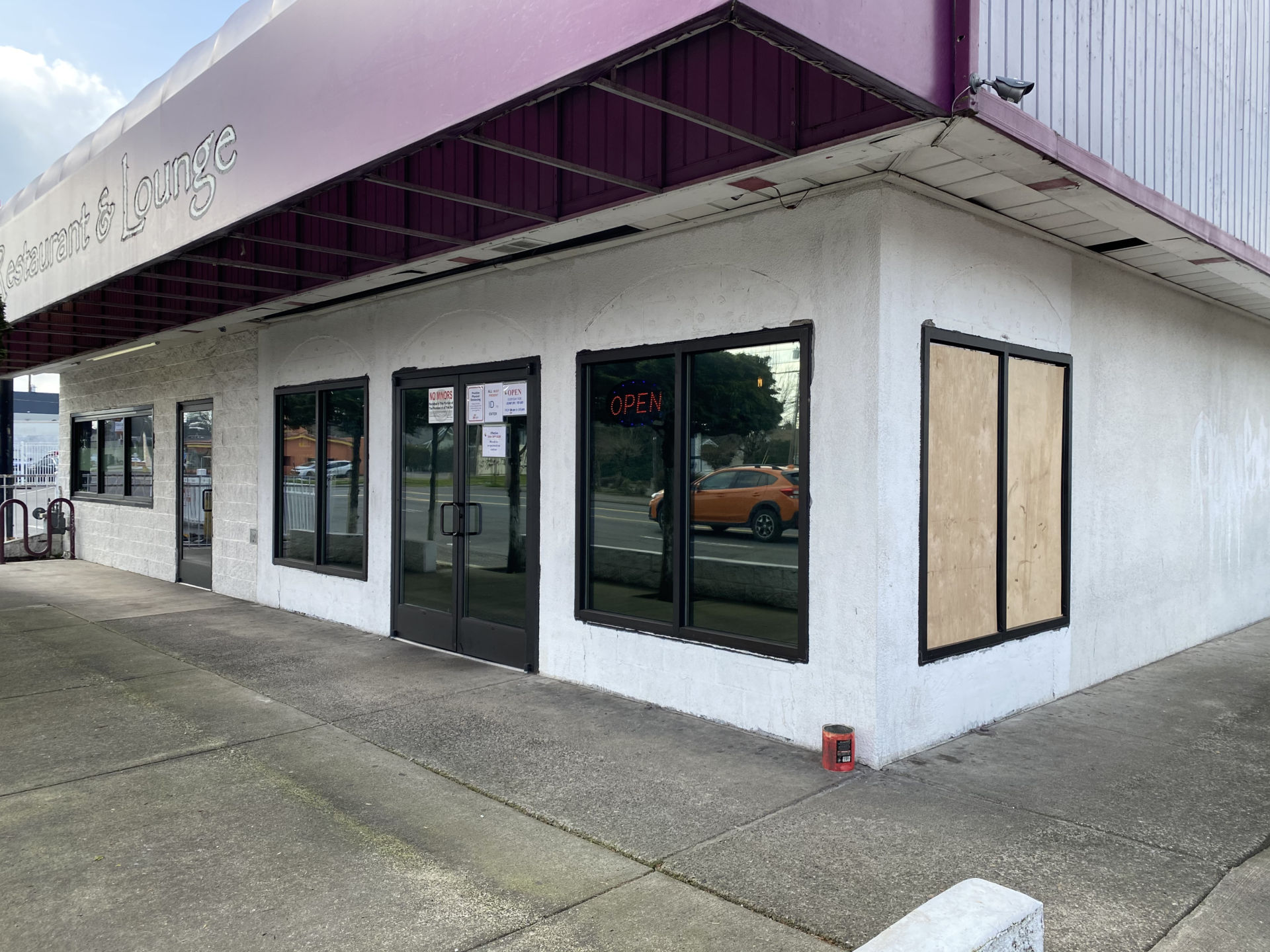 Nhà hàng Utopia Restaurant & Lounge ở Portland, Oregon, của ông Thu Nguyễn bị ném đá. Cửa bên hông phải dùng ván đóng lại vì bị vỡ. (Hình: Thu Nguyễn cung cấp)