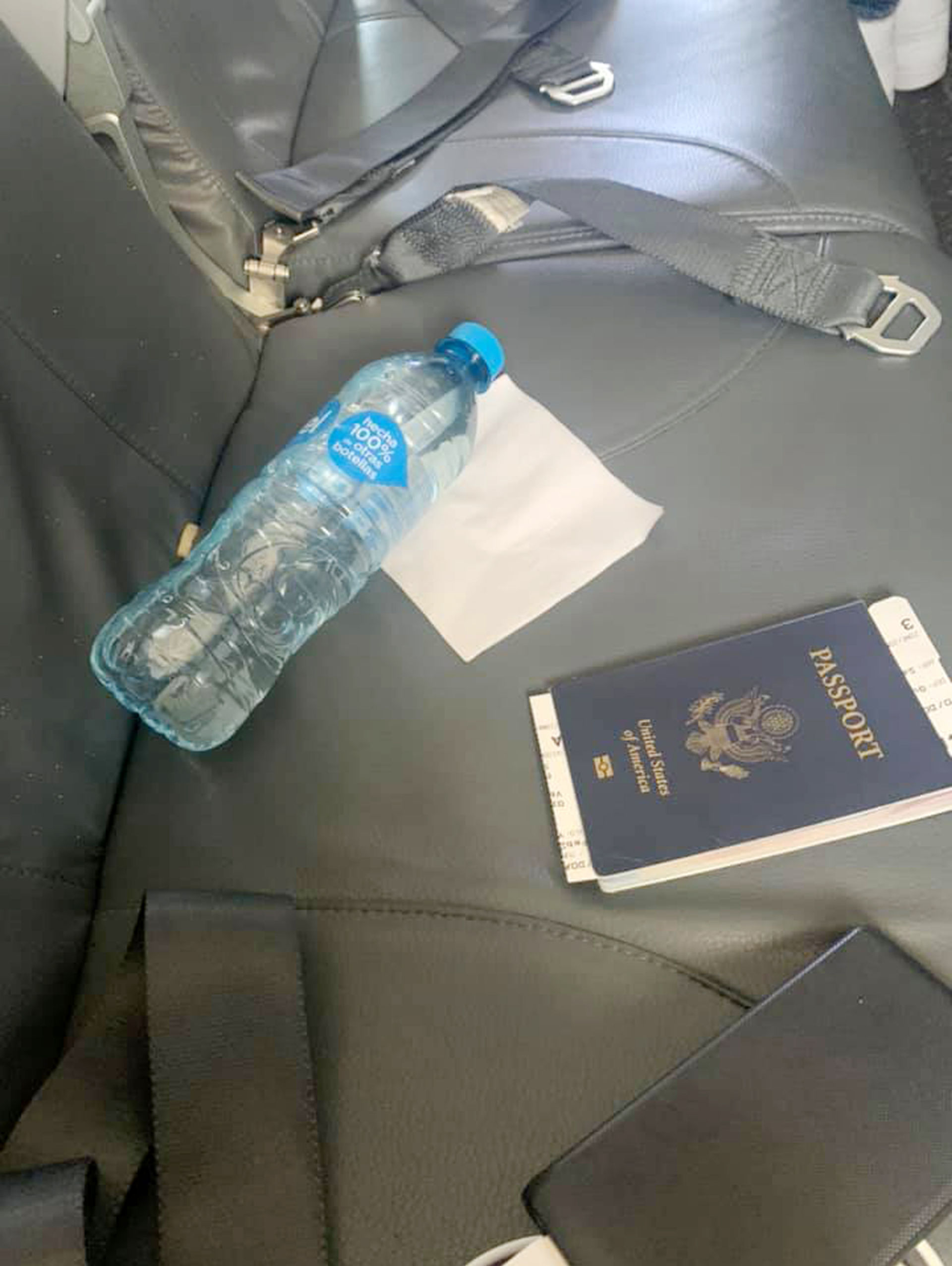 Chai nước bị ném vào ghế bên cạnh cô Tori Võ, cư dân của San Jose, California, trên một chuyến bay của hãng Volaris, chỉ vì cô là “người gốc Á.” (Hình: Tori Võ cung cấp)