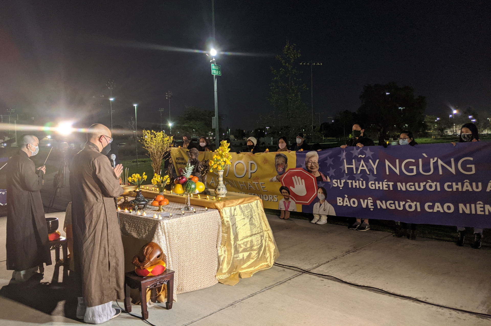 Các sư thầy làm lễ trước banner kêu gọi ngưng thù ghét người Á Châu. (Hình: Thiện Lê)