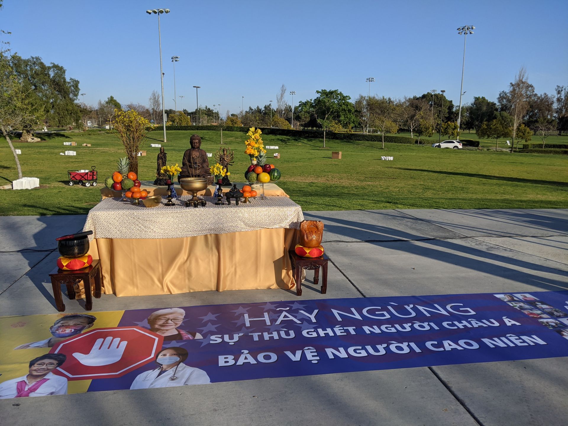 Bàn thờ và banner kêu gọi ngưng thù ghét người Á Châu. (Hình: Thiện Lê)