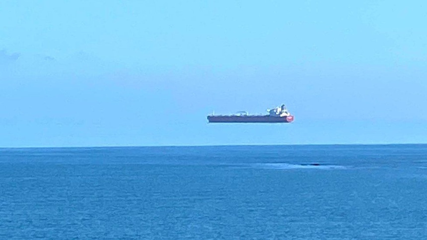Một con tàu ngoài khơi bờ biển Cornish, Anh trông như đang lơ lửng phía trên đường chân trời. Ảnh: David Morris.