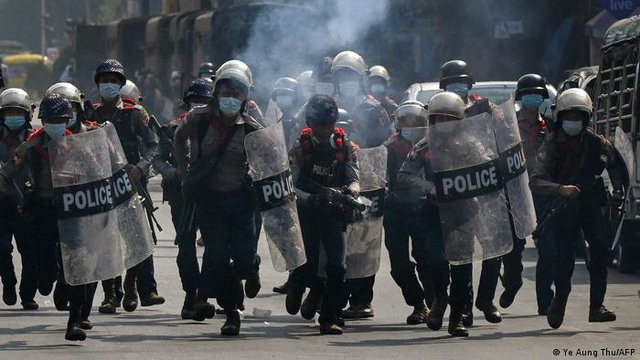 Cảnh sát Myanmar làm nhiệm vụ giải tán đám đông biểu tình. (Ảnh: AFP)