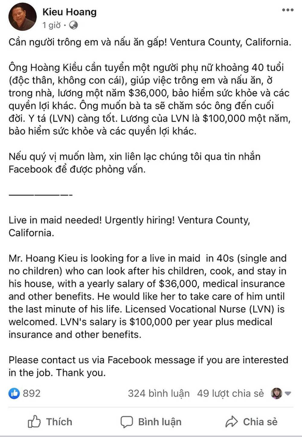 Ông Hoàng Kiều cần tuyển một người phụ nữ khoảng 40 tuổi (độc thân, không con cái), giúp việc trông em và nấu ăn, ở trong nhà, lương một năm 36,000 USD, bảo hiểm sức khỏe và các quyền lợi khác. Ông muốn bà ta sẽ chăm sóc ông đến cuối đời. Y tá (LVN) càng tốt. Lương của LVN là 100,000 USD một năm, bảo hiểm sức khỏe và các quyền lợi khác.