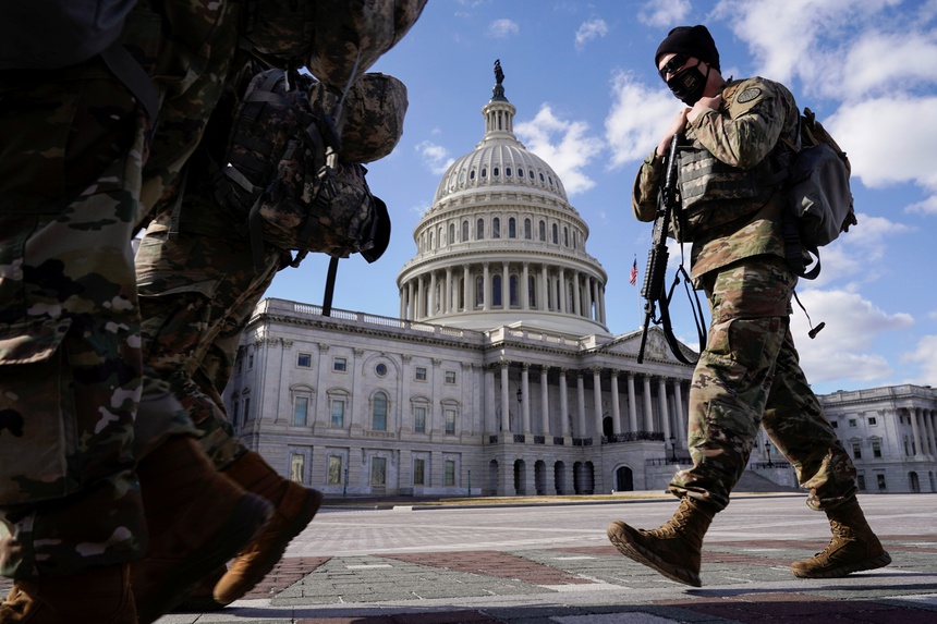 Vệ binh Quốc gia tuần tra bên ngoài tòa nhà quốc hội Mỹ ngày 6/3, khi Thượng viện đang bỏ phiếu thông qua gói ứng phó Covid-19. Ảnh: Reuters.