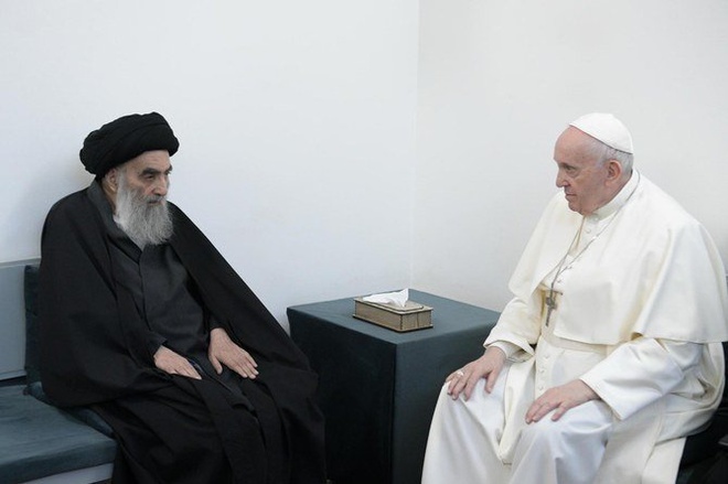 Họ gặp nhau trong chuyến thăm đầu tiên của Giáo hoàng Francis tới Iraq. Đây là chuyến đi đầu tiên của giáo hoàng ra nước ngoài kể từ khi đại dịch Covid-19 bắt đầu, theo Guardian.