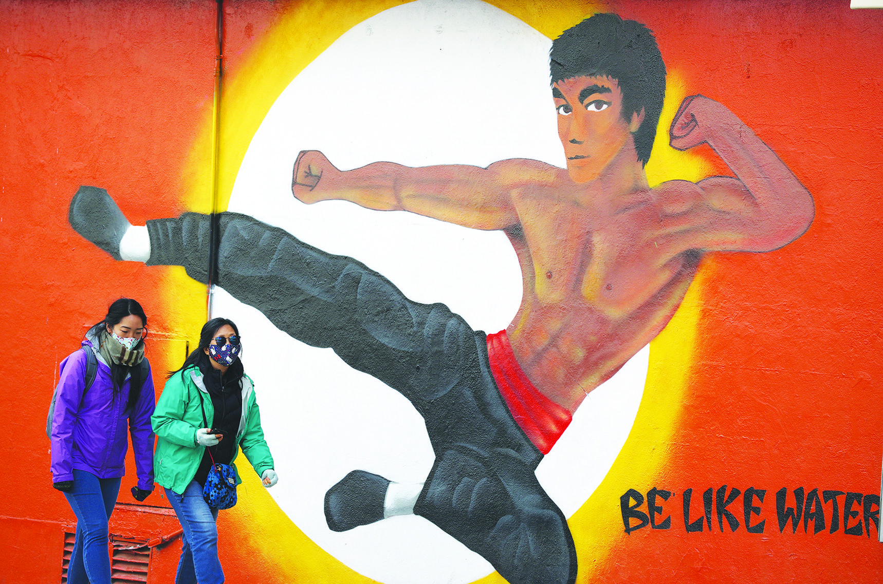 Làm sao đối phó nạn kỳ thị nhắm vào người Á Châu? Hình chụp ngày thứ Hai, 8 tháng 3, 2021 cho thấy hai người đang đi gần một bức tường vẽ hình Lý Tiểu Long (Bruce Lee) ở San Francisco, Bắc California. Sở cảnh sát và các tổ chức dân sự tại thành phố này đang tìm những giải pháp để đối phó nạn kỳ thị chủng tộc và tấn công đang gia tăng nhắm vào người Mỹ gốc Á Châu. Cộng đồng người Á Châu trên toàn nước Mỹ đã ghi nhận nhiều tội phạm liên quan đến sự kỳ thị như ăn cắp đồ trong tiệm, phá hoại tài sản, ném đá vào nhà, nói lời thù ghét hoặc đánh đập ở ngoài đường. Trong vùng San Francisco, một ông cụ gốc Thái Lan, 84 tuổi, đã qua đời sau khi bị người lạ xô té ở ngoài đường. (Justin Sullivan/ Getty Images)