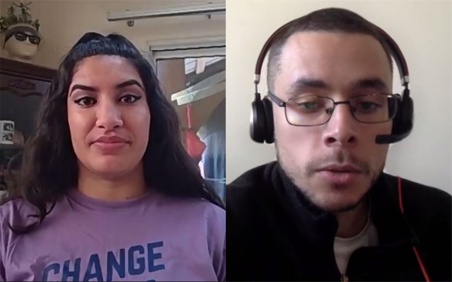 Cô Andrea Campos và anh Gabe Stewart, hai sinh viên gặp khó khăn vì nợ học phí. (Hình: Chụp từ màn hình Zoom)