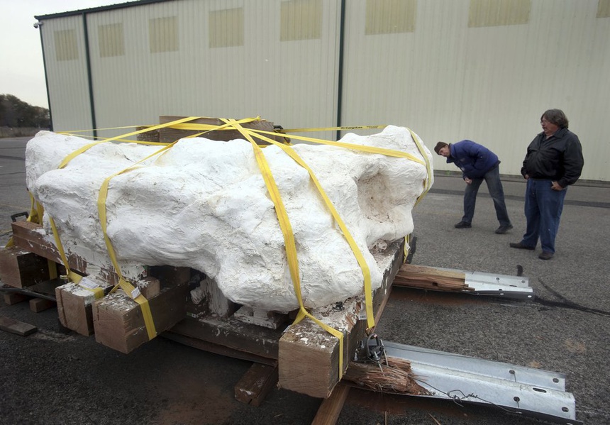 Tảng đá nặng 9 tấn chứa xương khủng long được bảo quản bằng thạch cao. Ảnh: AP.