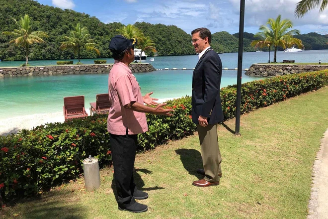 Bộ trưởng Quốc phòng Mỹ Mark Esper gặp Tổng thống Palau Tommy Remengesau tại Palau, ngày 28/8/2020 (Ảnh: US Defense Department/Jim Garamone)