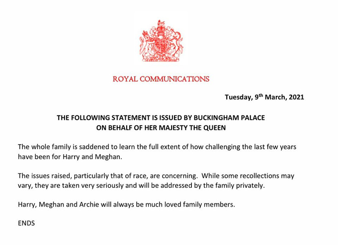 Ngoài ra, Nữ hoàng 93 tuổi cũng đặc biệt quan tâm đến lời buộc tội liên quan đến phân biệt chủng tộc và hứa sẽ "giải quyết một cách riêng tư". Sau tuyên bố này, Nữ hoàng được cho là sẽ có cuộc nói chuyện với các thành viên hoàng gia cao cấp - bao gồm Thái tử Charles, Nữ công tước xứ Cornwall Camilla, Hoàng tử William và Nữ công tước xứ Cambridge Kate - trong pḥng họp kín về những cáo buộc của nhà Sussex.