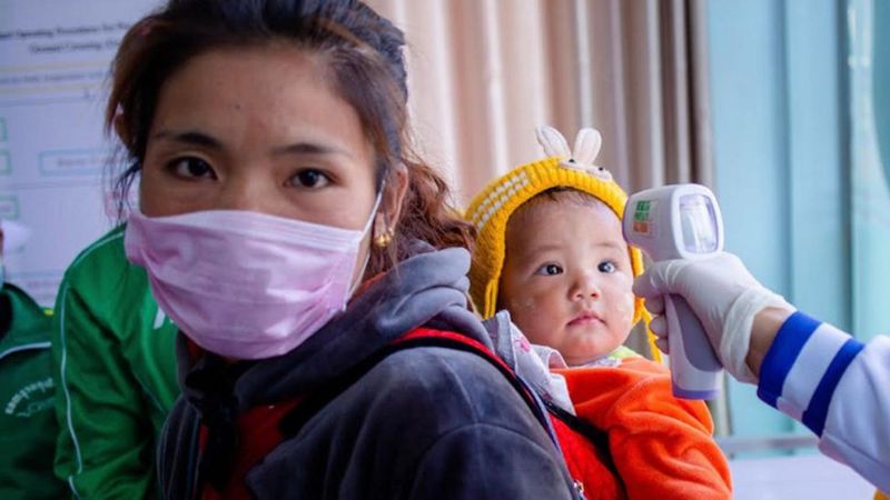 Nhân viên y tế kiểm tra nhiệt độ của một em nhỏ tại biên giới Myanmar và Trung Quốc