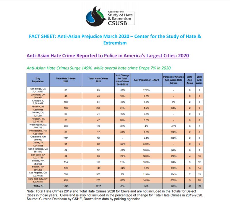 Báo cáo của Trung tâm Nghiên cứu về Chủ nghĩa Căm thù và Cực đoan tại Đại học California State University, San Bernardino (CSUSB) được công bố giữa lúc nhiều cuộc tấn công nhằm vào người lớn tuổi người Mỹ gốc Á đầu được truyền thông đưa tin trong những tuần gần đây.