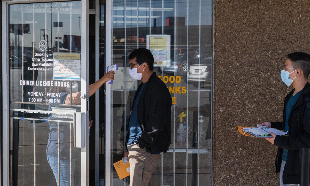 Một người đeo khẩu trang được kiểm tra thân nhiệt trước khi vào trụ sở chính quyền ở thành phố El Paso, bang Texas hôm 10/3. Ảnh: NYTimes.