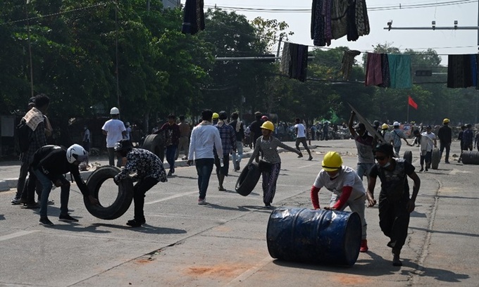 Người biểu tình dùng bánh xe, thùng phuy sắt dựng rào chắn ở Yangon hôm 11/3. Ảnh: AFP.