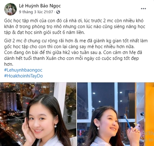 Nguồn gốc của thông tin khiến cư dân mạng xôn xao này đến từ bài viết trên trang cá nhân hôm 9/3 của Bảo Ngọc với nội dung: “Góc học tập mới của con đó cả nhà ơi. Lúc trước hai mẹ con còn nhiều khó khăn lắm, ở trong phòng trọ nhỏ nhưng con lúc nào cũng siêng năng học tập và đạt học sinh giỏi suốt 6 năm liền. Giờ hai mẹ con ở chung cư rộng rãi hơn và mẹ đã dành không gian tốt nhất làm góc học tập cho con thì con lại càng say mê học nhiều hơn nữa”.