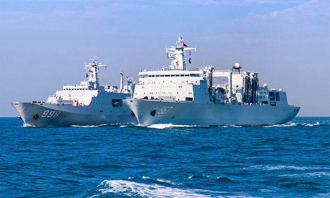 Tàu đổ bộ Côn Lôn Sơn và tàu hậu cần Tra Can Hồ diễn tập tại Biển Đông, ngày 14/1. Ảnh: PLA.