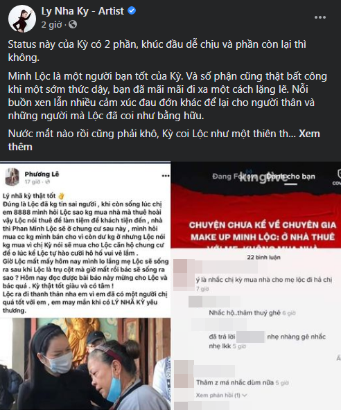 Người đẹp Lý Nhã Kỳ khẳng định cô chưa từng biết về chuyện mua nhà cho Minh Lộc như lời Hoa hậu Phương Lê chia sẻ. Trước đó, Phương Lê từng đăng bài khen ngợi Lý Nhã Kỳ khi cô sẵn sàng chu cấp cho mẹ của Minh Lộc và từng hứa mua nhà cho người cộng sự thân thiết. Sau bức tâm thư của Lý Nhã Kỳ, Hoa hậu Phương Lê đã đăng tải dòng trạng thái khá dài giải thích về những đồn đoán không hay trên mạng xã hội.