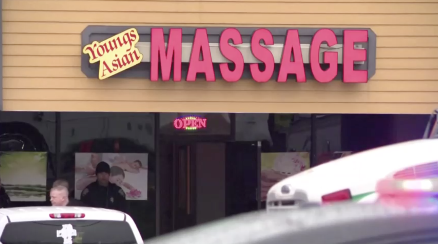 Vụ án bắt đầu vào khoảng 5 giờ chiều giờ địa phương khi nghi can nổ súng tại tiệm Young’s Asian Massage ở Quận Cherokee khiến 4 người thiệt mạng và 1 người bị thương. Cảnh sát trưởng Jay Baker cho biết 4 người thiệt mạng bao gồm một người đàn ông và một người phụ nữ da trắng, cùng với hai phụ nữ gốc Á. Người bị thương là một người đàn ông gốc Tây Ban Nha. Sau đó tại Atlanta, thủ phủ của tiểu bang, cảnh sát đã nhận được trình báo về một vụ cướp ngay trước 6 giờ chiều.