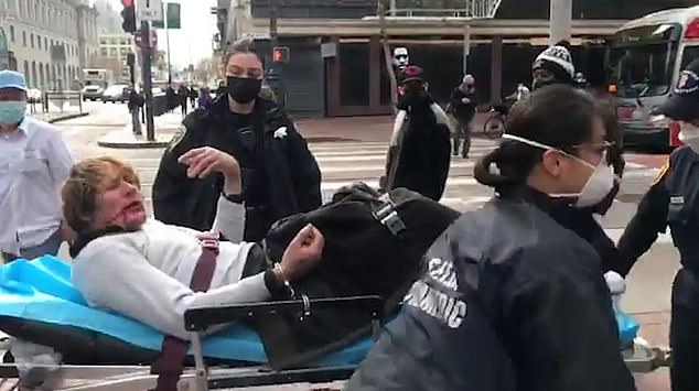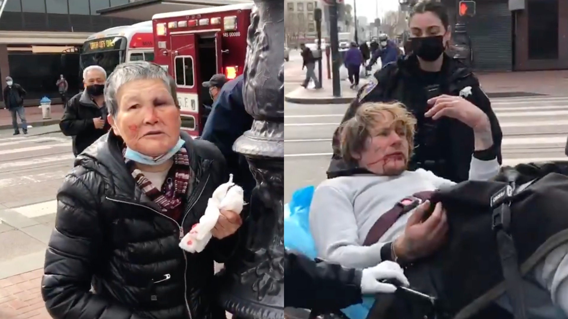 Người phụ nữ lớn tuổi cầm thanh gỗ chỉ về phía kẻ tấn công mình đang bị còng tay nằm trên cáng và hét lớn bằng tiếng Trung Quốc: "Đồ đê tiện, tại sao lại bắt nạt một bà già như tôi?". Sau đó, bà liên tục nói với mọi người: "Hắn ta đã đánh tôi, hắn ta đã đánh tôi".
