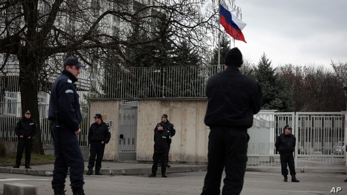 Cảnh sát Bulgaria đứng gác trước Đại sứ quán Nga ở Sofia. Ảnh: AP
