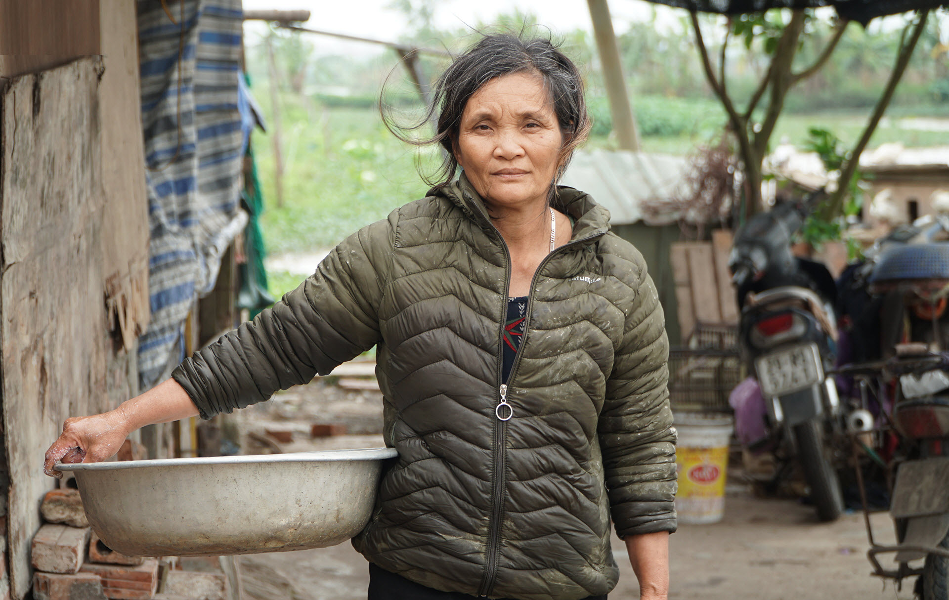 Gọi là nhà nhưng đây thực chất là một trong 5 chuồng nuôi lợn được cô và người cháu họ cùng làm, nhưng hai năm nay lợn đột nhiên chết, công việc nuôi lợn cũng tạm ngừng. Cô dành ra một gian giữa lợp tạm mái fibro xi măng, xung quanh cắm bốn cây gỗ rồi quây bạt làm chỗ trú mưa nắng.