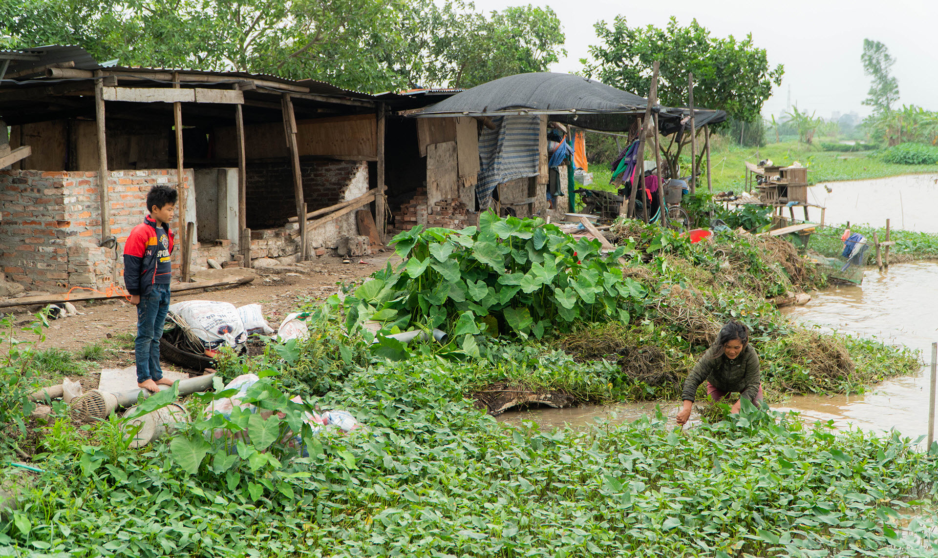 Vợ chồng cô từng dựng được một căn nhà cấp 4, nhưng khi con trai đi lấy vợ, cô nhường nhà cho vợ chồng con rồi dọn căn lều ngoài đồng. Những năm gần đây, anh em họ hàng có làm thêm một nhà tôn (giống thùng container) cho các con tại mảnh đất trống, còn cô Hải vẫn ở căn nhà sát chuồng lợn để tiện trông ao cá, nuôi gà, vịt.