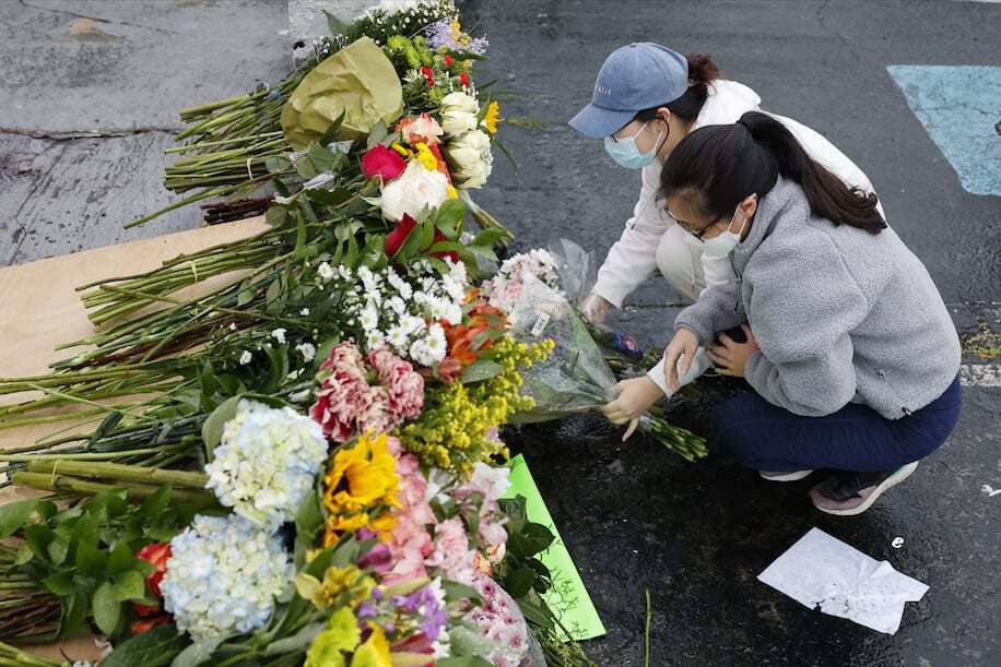 Jenny Choi và Kristi You cắm hoa ở lối vào của Gold Spa, một trong ba địa điểm ở khu vực Atlanta, nơi xảy ra vụ xả súng chết người. Sáu trong số tám người thiệt mạng là phụ nữ châu Á. Ảnh: Washington Post.