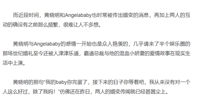 Những động thái kỳ lạ của Angelababy trong thời gian qua đã khiến công chúng tin rằng hôn nhân của cô và Huỳnh Hiểu Minh đã rạn nứt, sớm muộn gì thì cặp đôi cũng sẽ "đường ai nấy đi". Theo trang NetEase, dù Huỳnh Hiểu Minh bên ngoài vẫn thể hiện tình cảm với Angelababy nhưng đằng sau đó, tài tử Thần điêu đại hiệp đã căm phẫn và còn nói: "Baby của tôi, cô xong đời rồi, ngày tháng sau này cô cứ chờ xem. Tôi từ trước đến nay chưa từng tốt với ai như vậy, trừ mẹ tôi ra".